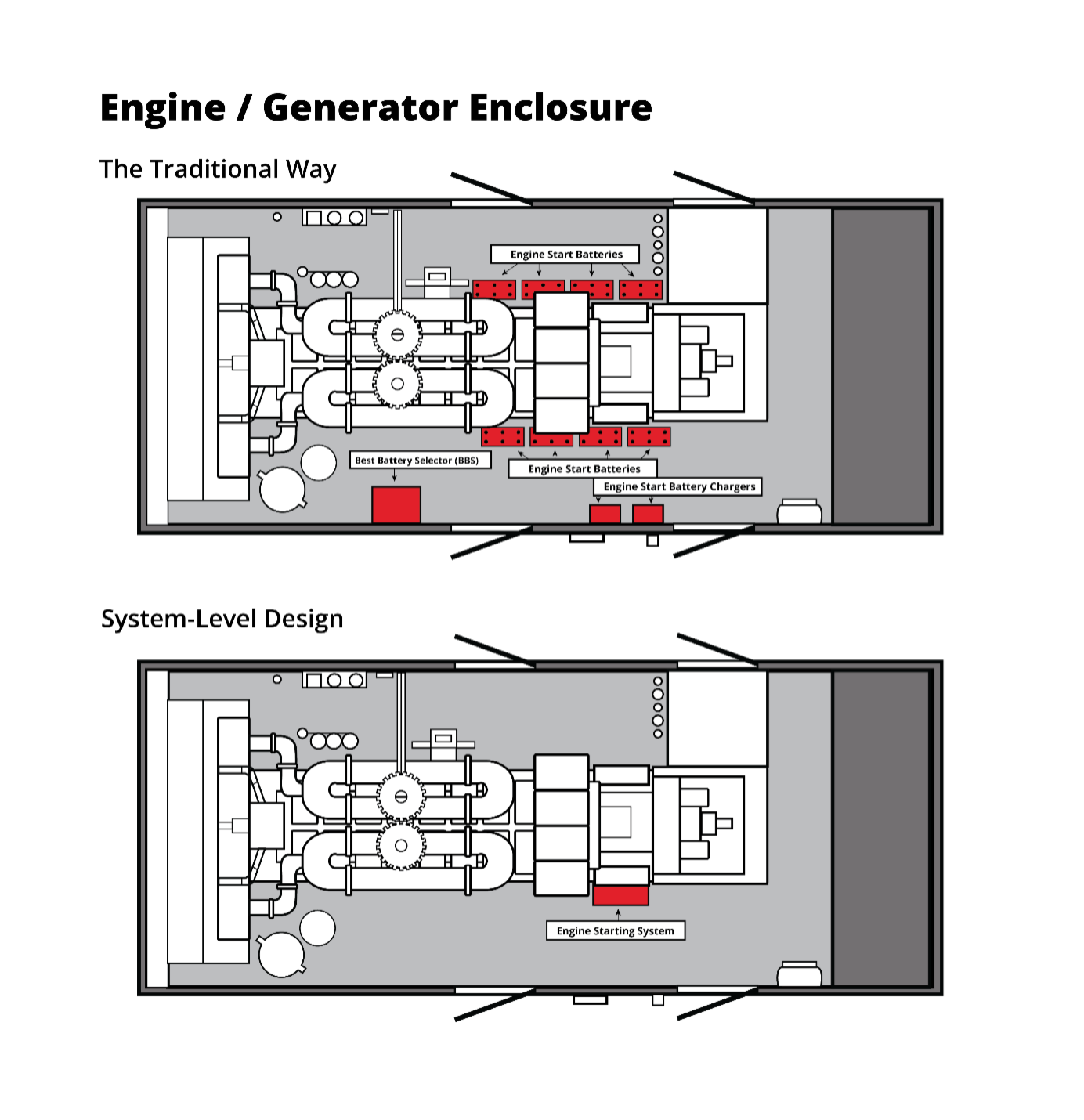Packaged engine starting systems house high-performance batteries with an integrated charger, best battery selectors, alternator and engine panel power redundancy, DC disconnects and racking, ensuring the greatest total system reliability in the smallest possible footprint.