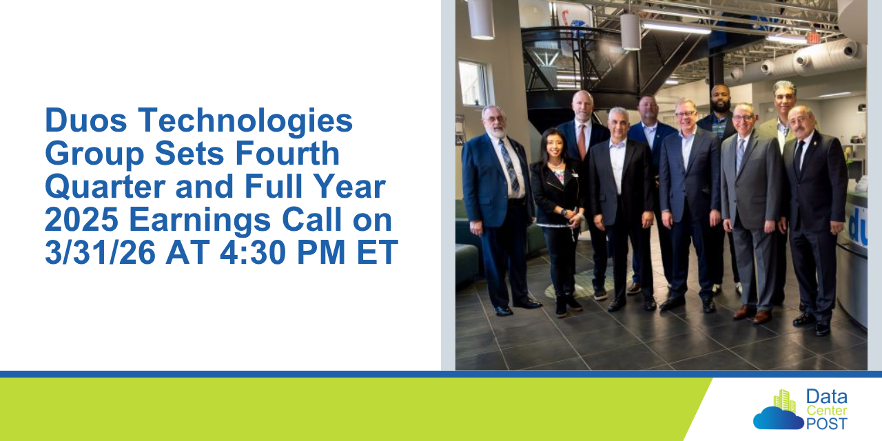 Duos Technologies Group, Inc. (Nasdaq: DUOT), a provider of modular, colocation Edge and AI data centers and technology infrastructure solutions, has scheduled its fourth quarter and full year 2025 earnings call for Tuesday, March 31, 2026 at 4:30 p.m. Eastern Time.
